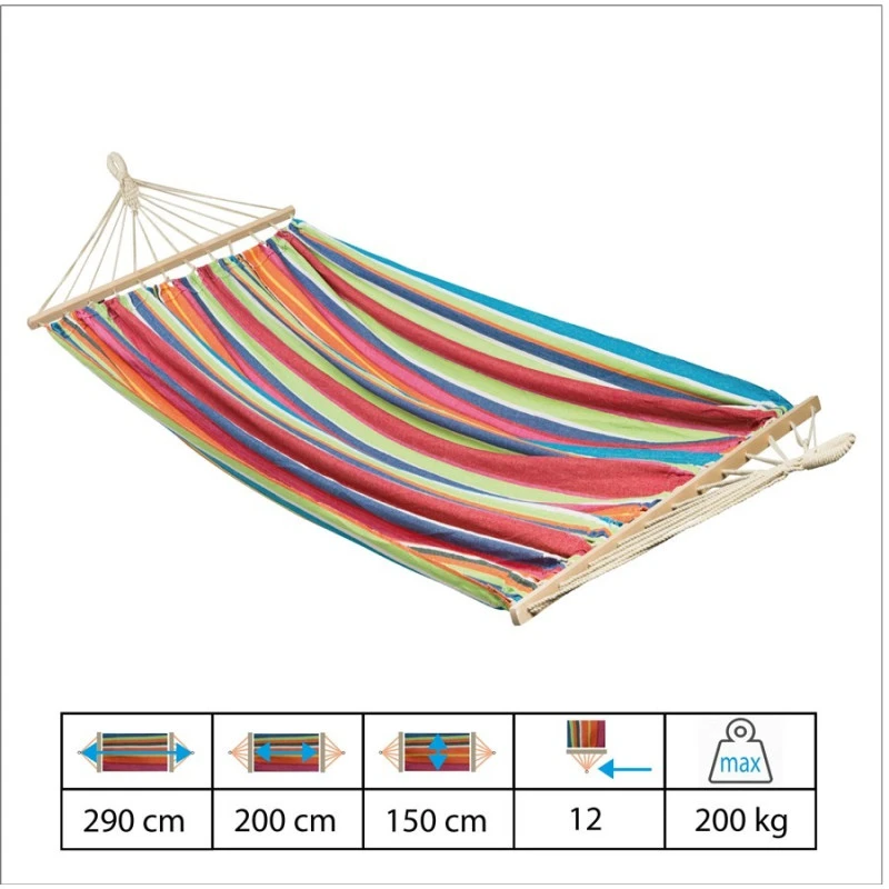 Le « Bien Etre » de CAO OUTDOOR est un hamac grande largeur double pour deux personnes avec écarteurs, conçu pour le plein air au camping, bateau ou camping-car et fourgon aménagé.