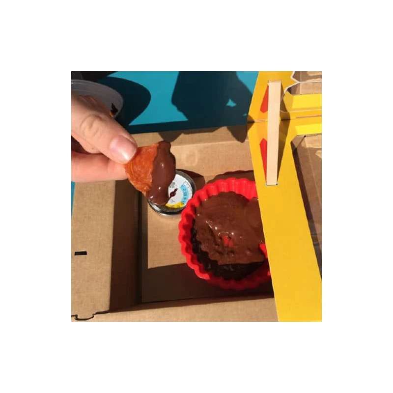 Préparez votre repas ou votre goûter que vous venez déposer dans le tiroir, laissez place à votre imagination et votre gourmandise ! A l’aide du trait viseur, orientez le face au soleil et inclinez ensuite le panneau miroir de manière à renvoyer les rayons du soleil dans la fenêtre de votre tiroir. En quelques minutes, vous pourrez faire fondre du chocolat, du fromage ou même réchauffer des plats !